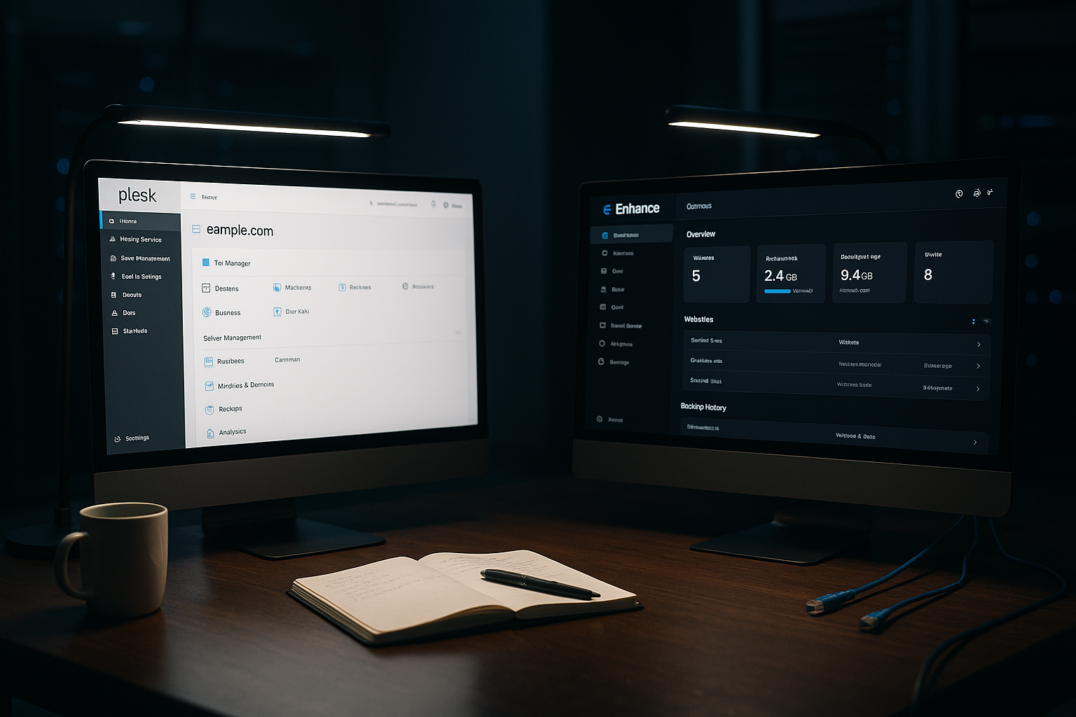 På panelniveau er det værd ikke at undervurdere brugergrænsefladen: Træg brugerflade koster tid hver dag. I mine målinger reagerer Enhance meget hurtigt, mens Plesk forbliver stabil takket være mange års optimering. Begge føles betydeligt bedre med SSD/NVMe-lagring - især til backup og pakkehåndtering.