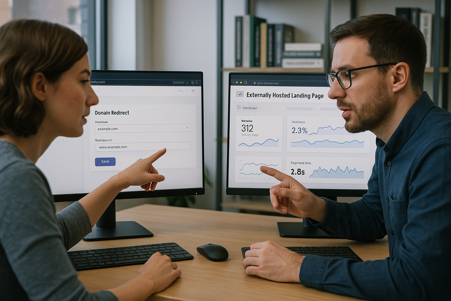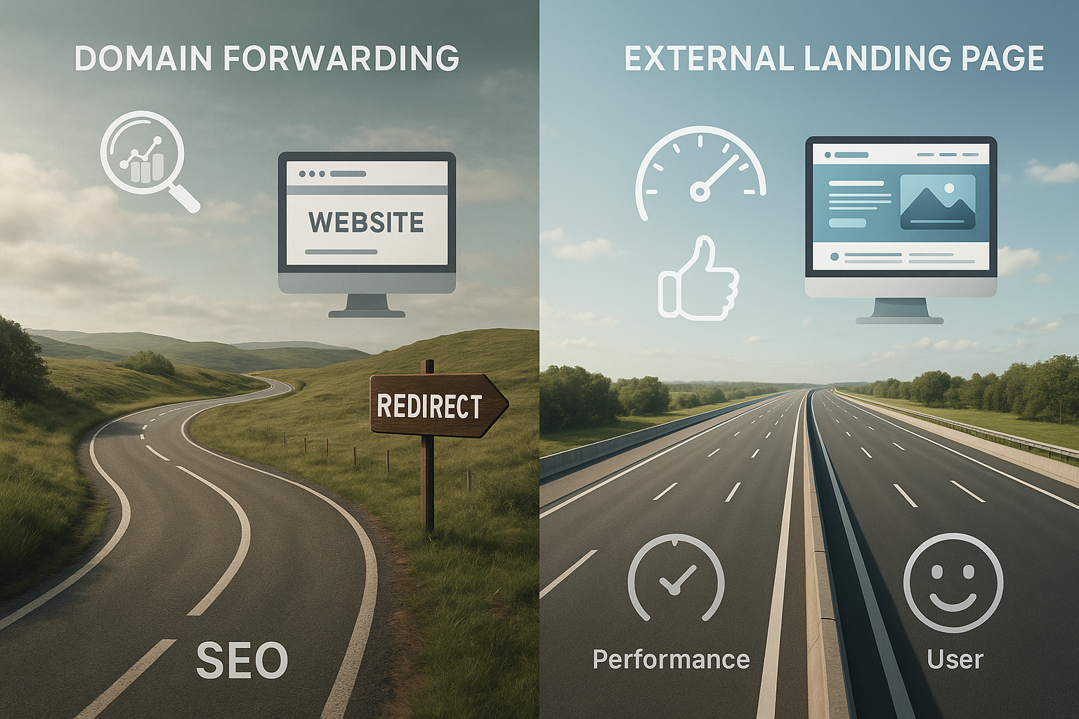 Domain weiterleitung oder externe Landingpage? Ich zeige, wie diese Entscheidung SEO-Signale, technisches Tempo und die Nutzererfahrung beeinflusst – inklusive klarer Kriterien, Hosting-Faktoren und Setup-Schritten. Ich erkläre, wann ein permanenter Redirect Reichweite bündelt, wann eine eigenständige Seite Conversion treibt und wie ich beide Varianten messbar steuere.