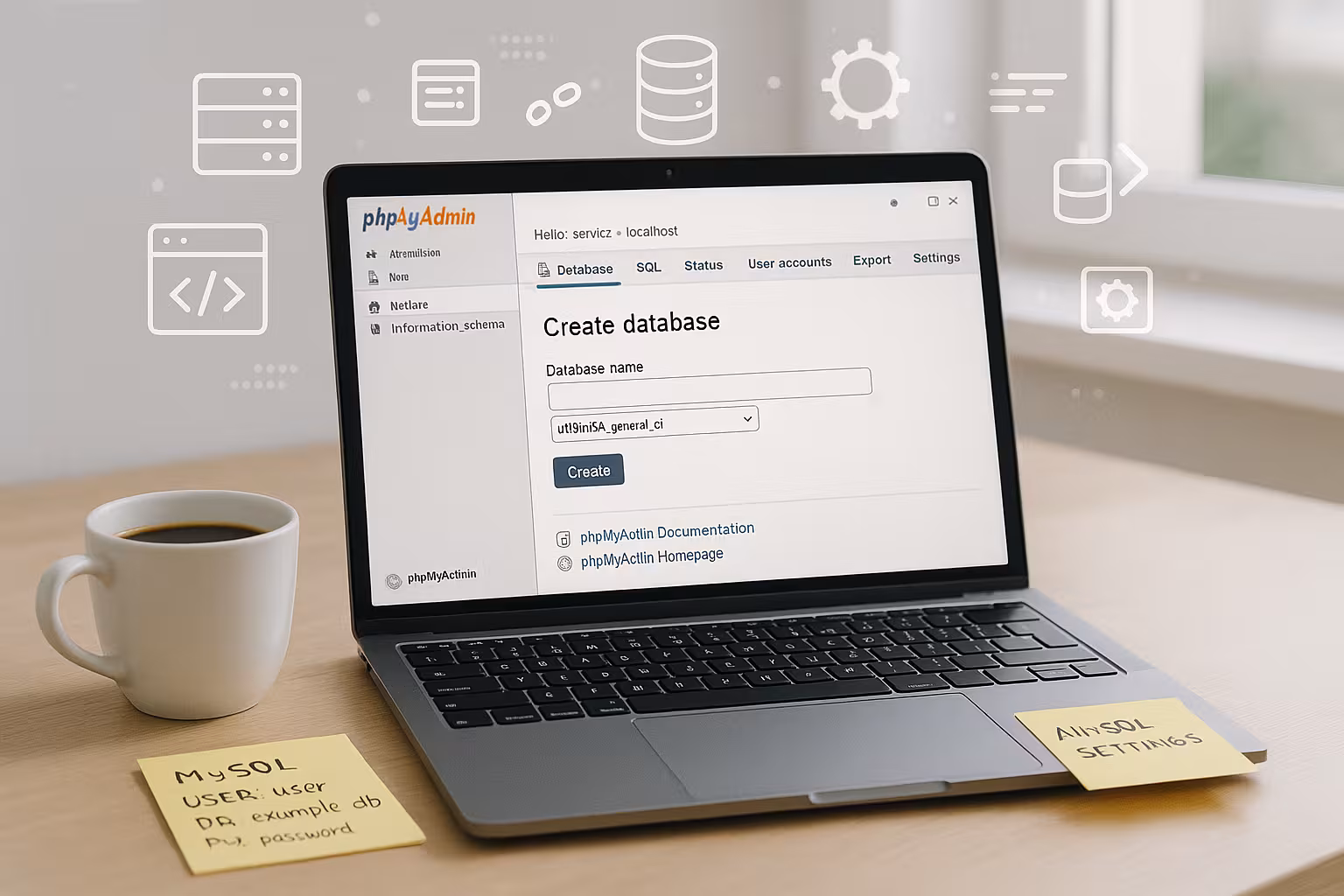 Pirmiausia KAS sistemoje sukuriu naują duomenų bazę ir priskiriu unikalų Vardai be specialiųjų ženklų. Tada sukuriu duomenų bazės naudotoją ir pasirenku stiprų slaptažodį, sudarytą iš ilgų atsitiktinių simbolių. Visus duomenis išsaugau slaptažodžių tvarkyklėje, kad vėliau galėčiau juos greitai pasiekti ir nieko nepamirščiau. Greitai peržiūrai naudoju kompaktišką "MySQL-Guide" su pagrindiniais žingsniais. Taip palaikau švarią bazę ir užtikrinu, kad nebūtų klaidų. Pradžia.