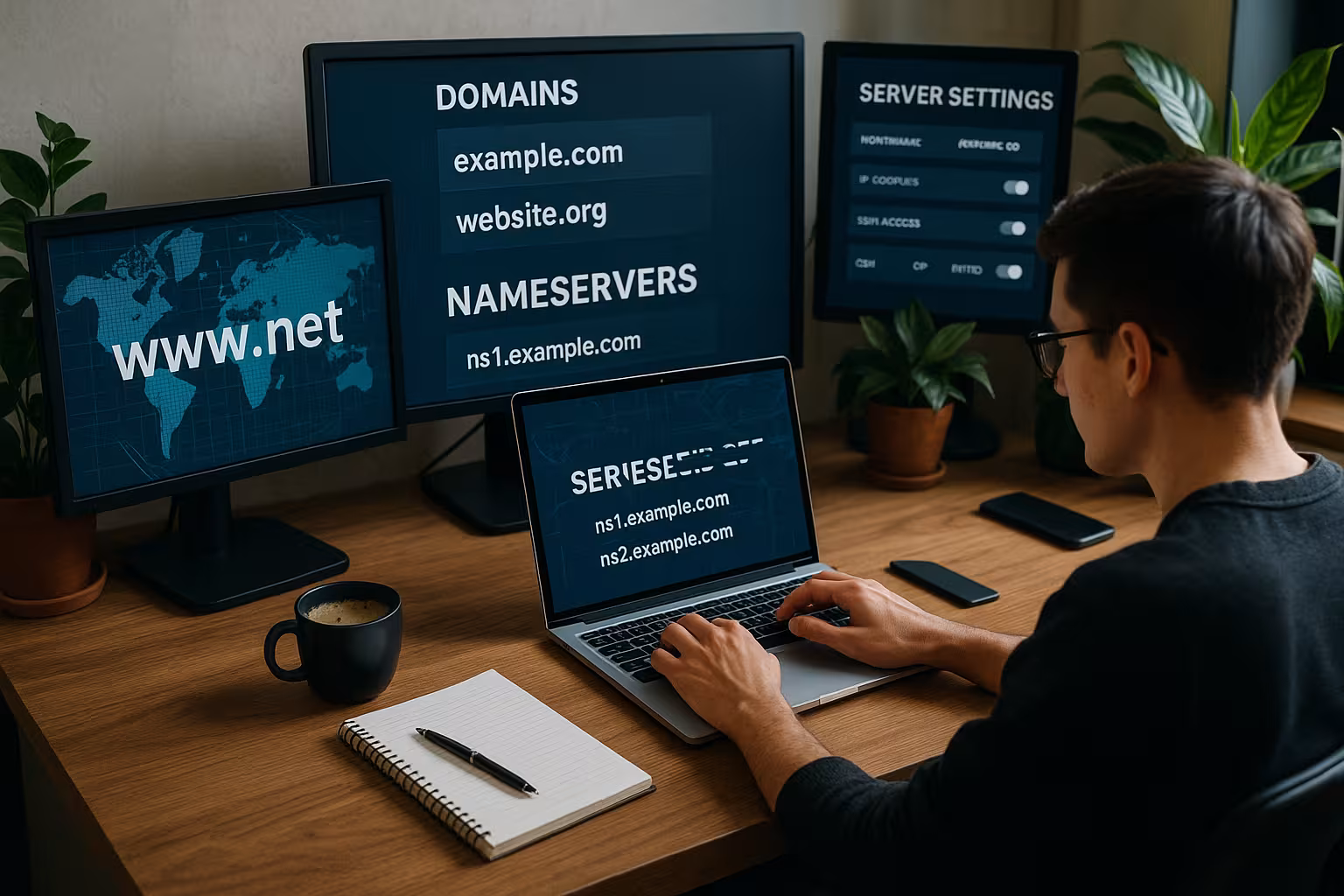 Naamservers zetten domeinnamen om in IP-adressen en sturen verzoeken door naar de juiste servers. De meeste hostingpakketten bevatten standaard al DNS-servers, maar deze beperken vaak de configuratiemogelijkheden. Zodra u bijvoorbeeld SPF-, DKIM- of SRV-records flexibel wilt beheren, is de eigen naamservers redelijk.
