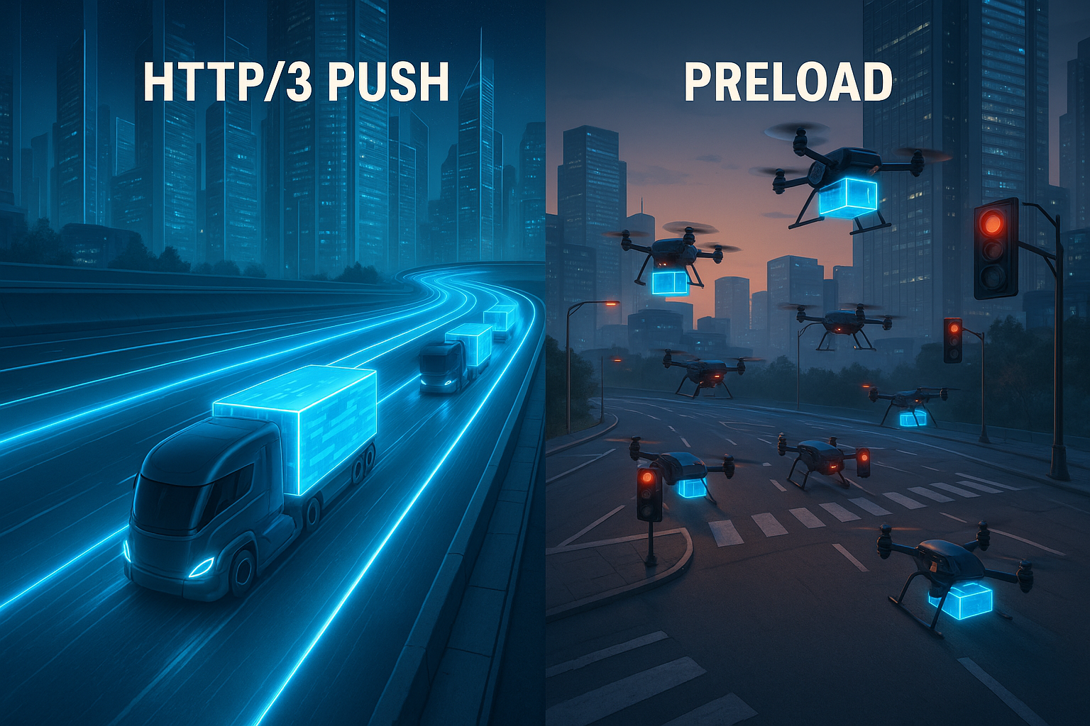 Am stabilit Server Push atunci când serverul livrează fișiere înainte ca browserul să le solicite, de exemplu CSS, JS sau fonturi web care sunt necesare direct pentru redare. Această tactică plasează resursele în cache din timp, economisește drumurile dus-întors și poate favoriza în mod vizibil Prima Vopsea Contentful. Preîncărcare pe de altă parte, folosesc etichete de legătură în marcaj, astfel încât browserul să știe exact ce fișier trebuie să încarce mai întâi. Acest lucru creează priorități clare, reduce transferurile duplicate și funcționează la fel de bine cu HTTP/1.1, HTTP/2 și HTTP/3. Deoarece HTTP/3 se bazează pe QUIC, merită să aruncați o privire la Protocolul QUIC, care tratează fluxurile separat și evită astfel congestionarea la nivel de linie.