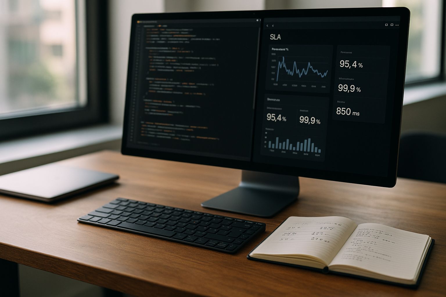 Я определяю каждую ключевую фигуру полныйИмя, задействованные системы, интервал измерения, источники данных, формула и целевые значения. Для времени безотказной работы я использую ежемесячную основу и устанавливаю точные конечные точки измерения, такие как статус HTTP, проверка содержимого и пороговые значения задержки. Формула указана в контракте, например: (минуты работы - минуты простоя) / минуты работы × 100. В качестве источников данных я принимаю API-интерфейсы мониторинга и журналы центра обработки данных, которые я могу просматривать. Для выбора и настройки необходимо Сравнение инструментов мониторингакоторый охватывает оповещения и отчеты.