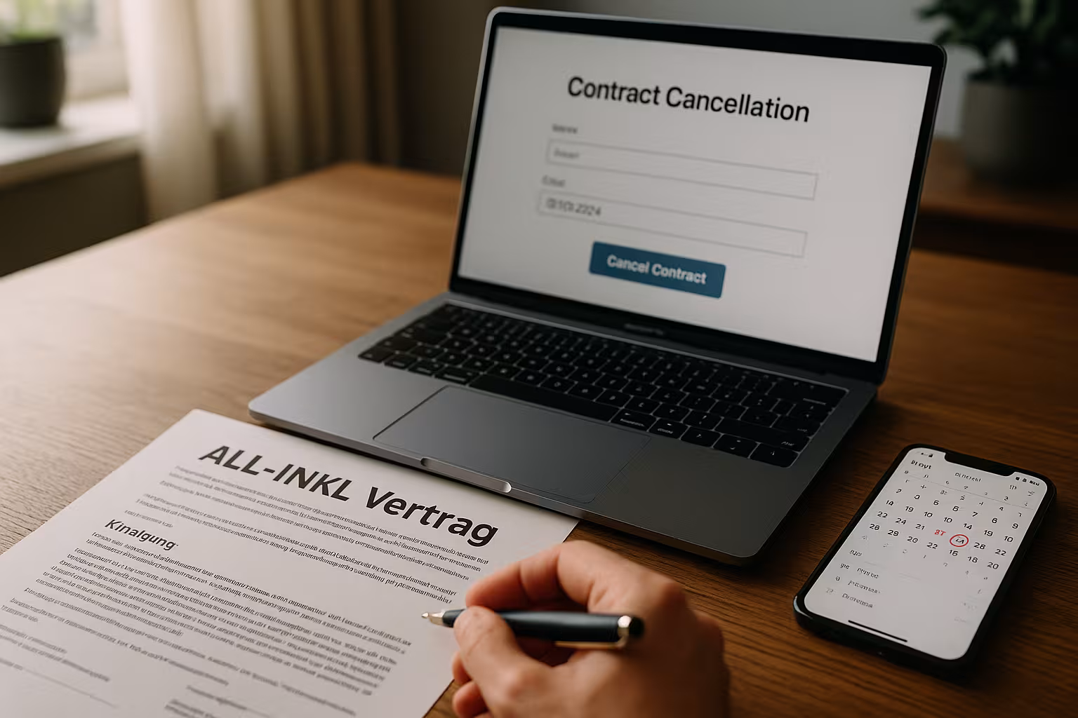 All-Inkl kan sägas upp utan en fast minimiperiod om jag följer den valda betalningsperioden och den rekommenderade uppsägningstiden på sju dagar före utgången. Jag kommer att visa dig de olika sätten att säga upp, konsekvenserna av omedelbar uppsägning och hur du överför domäner på ett säkert sätt.