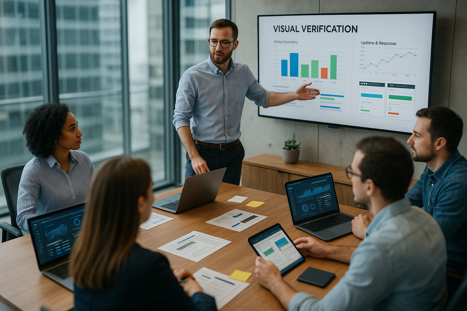Visual Verification bildet die Prüfbrille des menschlichen Auges maschinell nach und setzt auf automatisierte Sichtkontrollen. Ich lasse echte Browser Instanzen starten, erfasse den DOM-Zustand, prüfe die Render-Ergebnisse und werte die optische Integrität aus. Das ergänzt klassische Checks wie HTTP-Status, TTFB oder CPU-Load, weil die sichtbare Oberfläche für Nutzer die eigentliche Wahrnehmung steuert. Buttons, Slider, Navigationen und CTAs müssen auftauchen, klickbar sein und korrekt reagieren, sonst zählt der Dienst aus Nutzersicht als gestört. Genau hier liefert Visual Verification den entscheidenden Blick auf das, was Anwender wirklich sehen und bedienen.