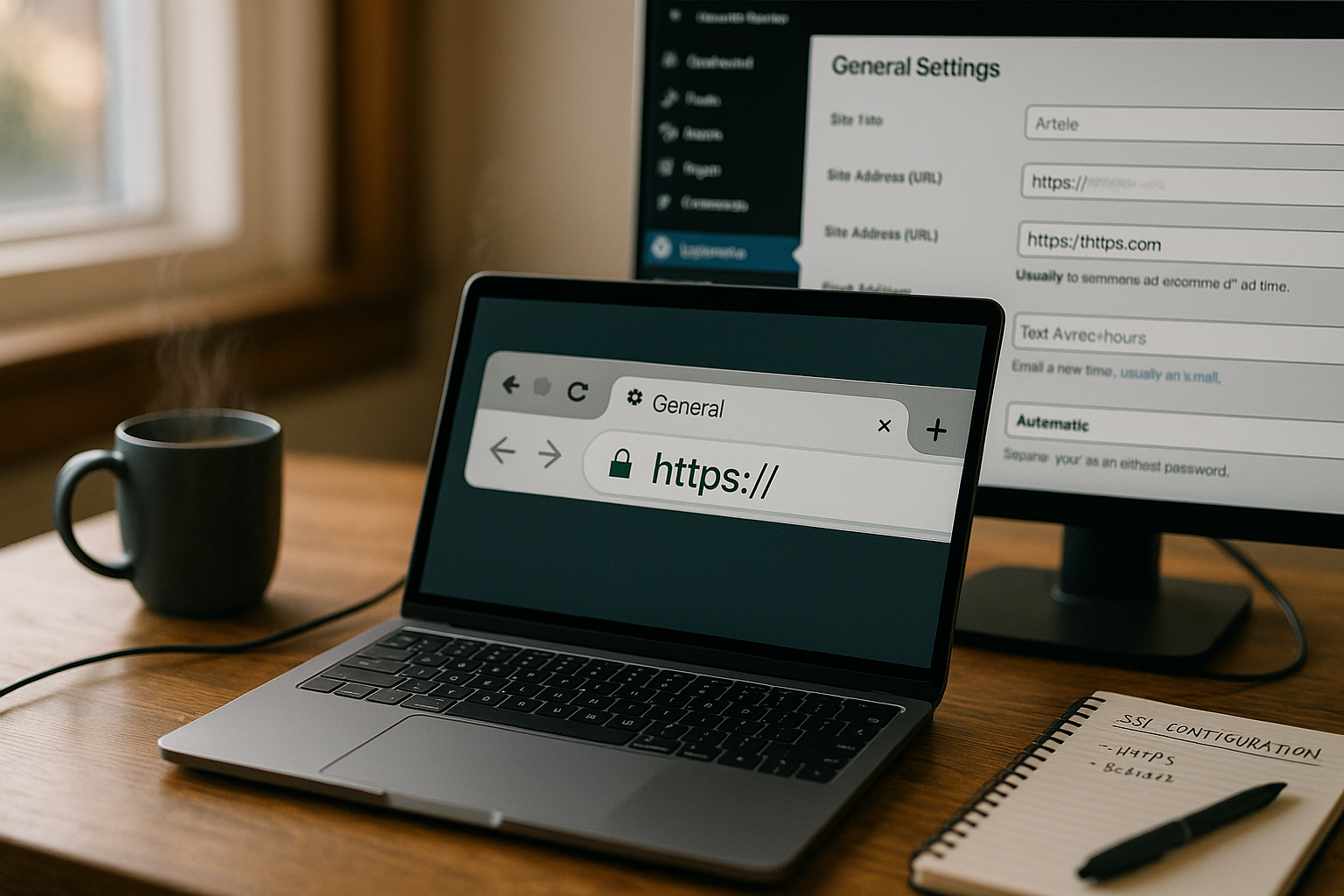 Ich melde mich im Dashboard an und öffne Einstellungen → Allgemein, dann setze ich „WordPress‑Adresse (URL)“ und „Website‑Adresse (URL)“ auf https://. Nach dem Speichern melde ich mich erneut an, falls die Sitzung neu startet. Anschließend lösche ich Browser‑Cache und, falls vorhanden, den Cache meines Caching‑Plugins, damit Besucher sofort die sichere Variante erhalten. Widgets, Menüs und harte Links schaue ich mir danach an, denn dort können noch http‑Verweise stehen. Für Medien in Beiträgen editiere ich einzelne Inhalte oder plane eine saubere Suche in der Datenbank (siehe unten).