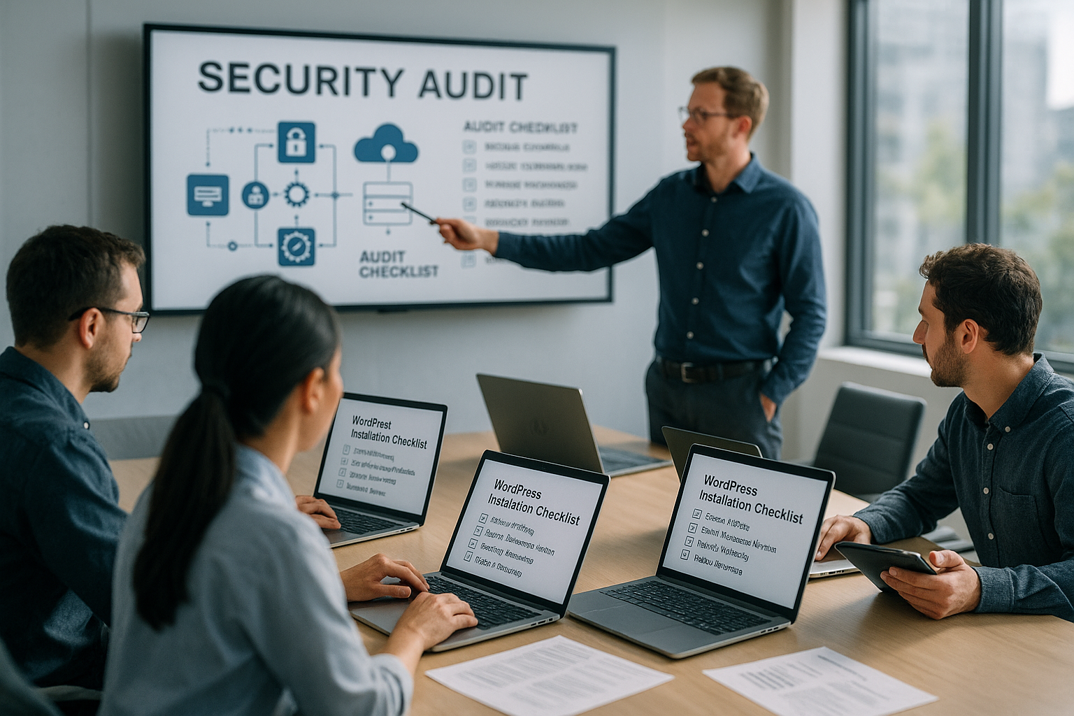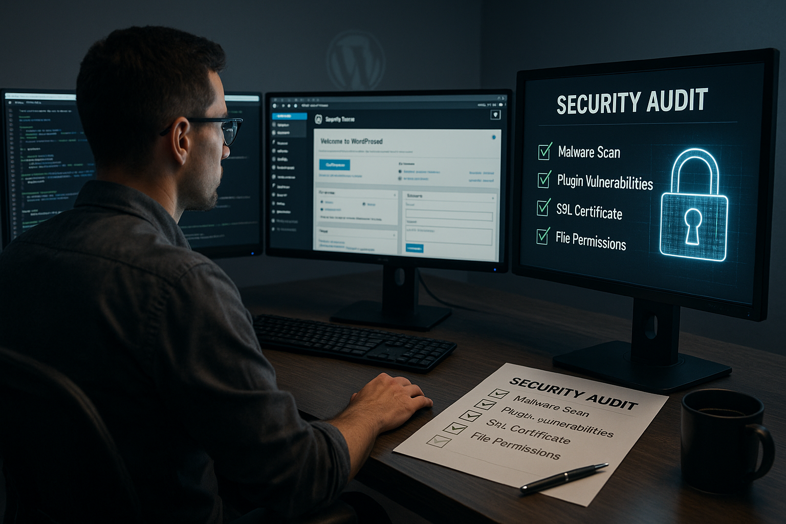 Ein strukturiertes WordPress Sicherheits-Audit beim Hoster verbindet Technik, Prozesse und klare Verantwortlichkeiten. Ich beginne mit Updates und Integrität, sichere Zugänge, stärke Hosting-Features, erzwinge HTTPS und härte Rechte sowie Konfiguration. WAF, Security-Plugins, Backups und Log-Analysen laufen danach kontinuierlich und messbar. Ich halte alles in kurzen Notizen fest, teste Restore-Prozesse und bleibe mit regelmäßigen Scans wachsam. So bleibt die Website verfügbar, nachvollziehbar geschützt und auditierbar über den gesamten Lebenszyklus.